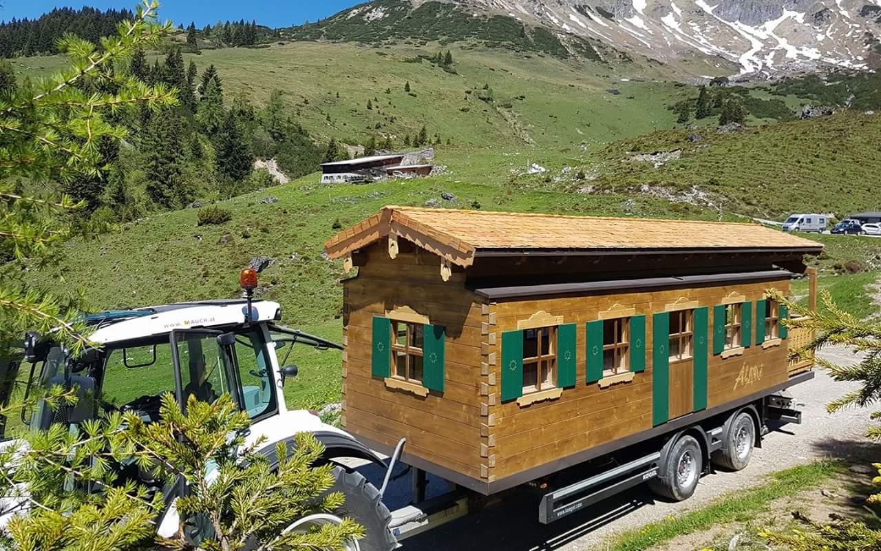 Ein Traktor mit einem Anhänger aus Holz, eine fahrbare Almhütte. Mit dem Shuttle gelangt man mühelos auf die Kirchgasshütte/Aualm und wieder zurück nach Filzmoos.