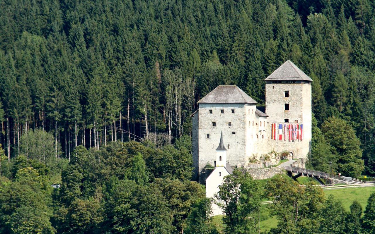Burg Mauterndorf Ansicht Frontturm mit Seitengebaeuden im Sommer