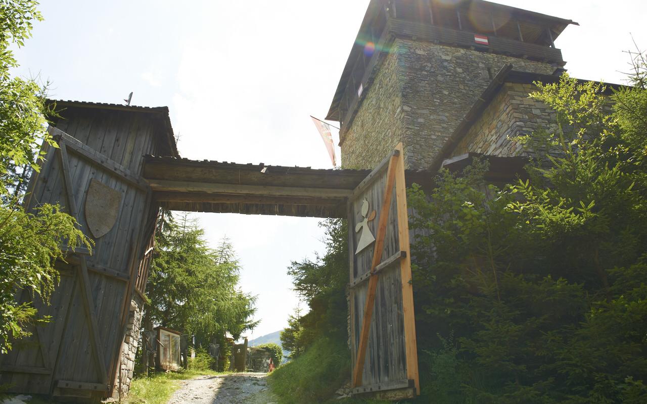 Burg Mauterndorf Ansicht Frontturm mit Seitengebaeuden im Sommer