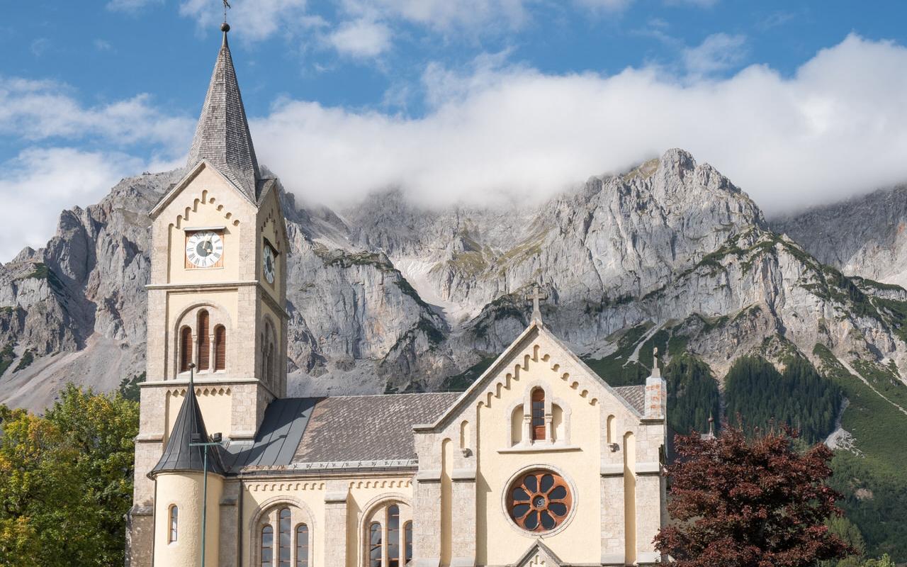 Der Bau der schönen neuromantischen Kirche erfolgte von 1888 - 1895. Der besonders harte Stein der Kirche wurde mühsam aus der Kramllahn in Ramsau gebrochen, gehauen und zur Baustelle transportiert. Ihren besonderen Charme erhält die Kirche durch die vielen ganz aus Holz gefertigten Emporen.