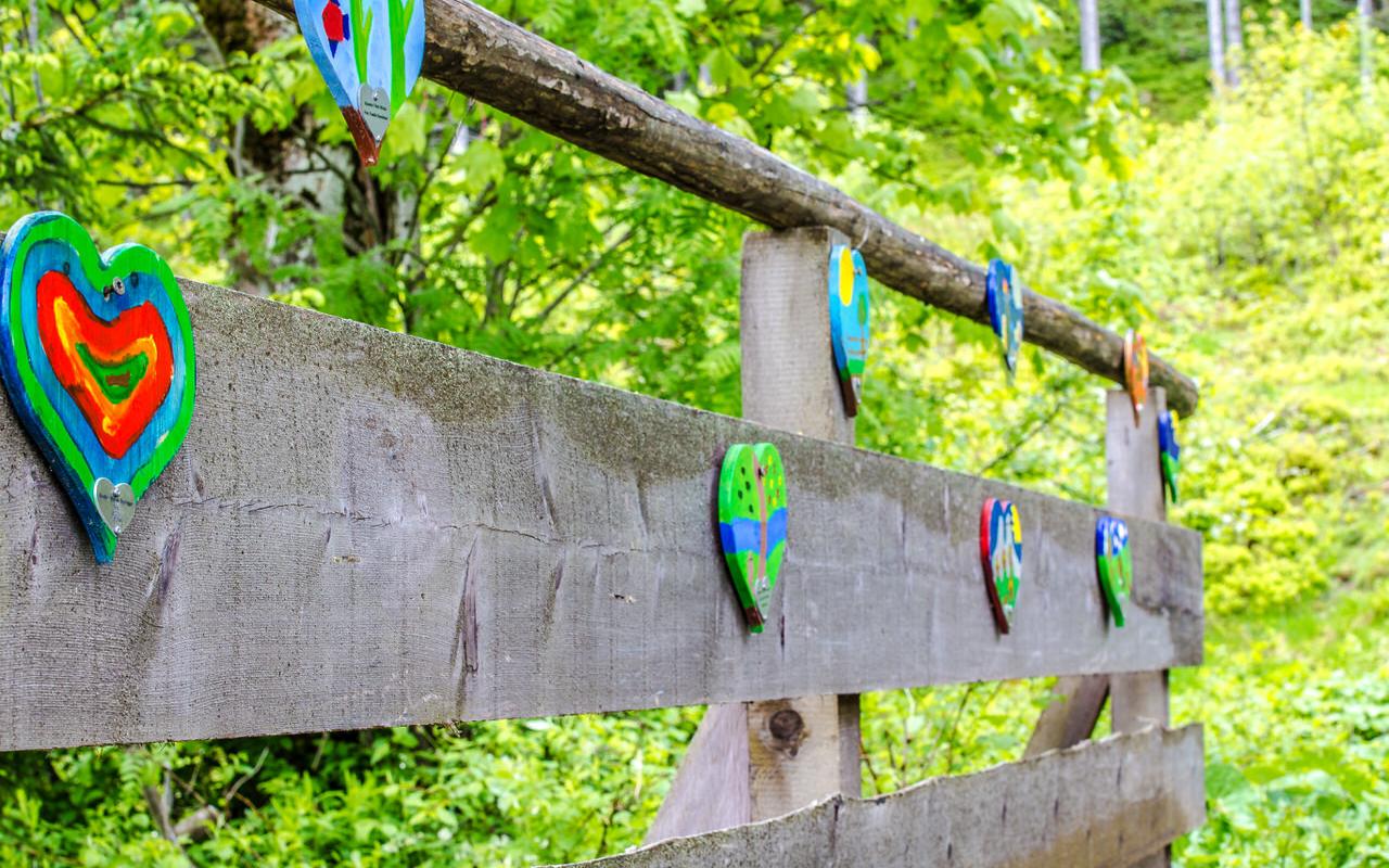 Der Weg ist gesäumt von Holzherzen, die von den Kindern der Volksschule gestaltet werden. Jedes Herz hat einen Paten, der mit seiner Spende Unicef unterstützt.
