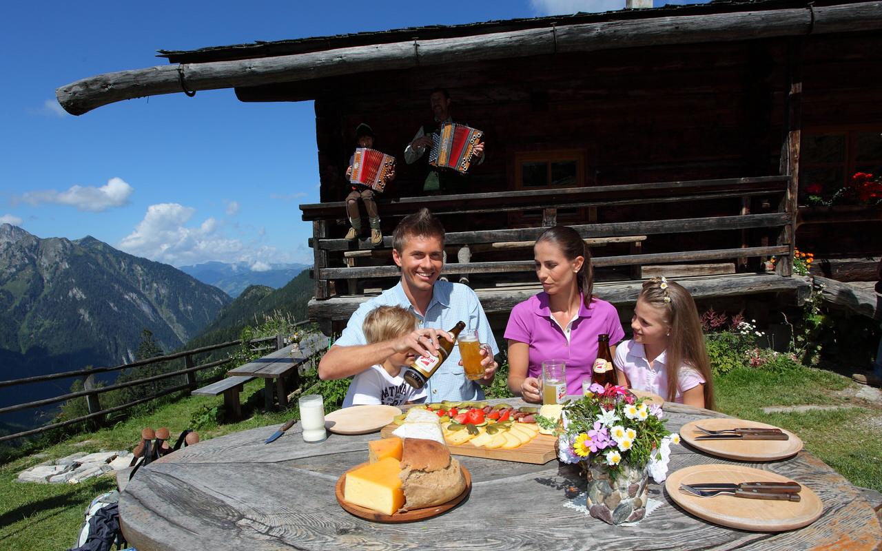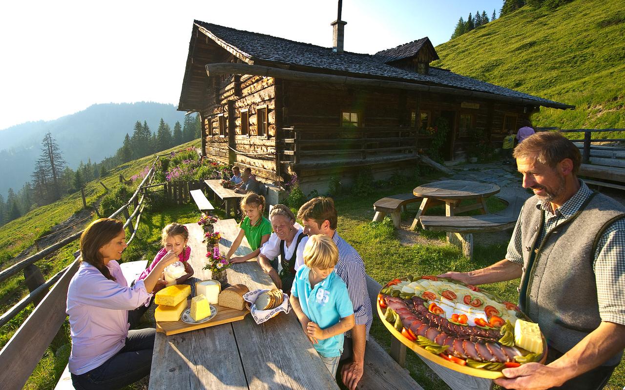 Wanderer bei einer gemutlichen Jause auf der Alm