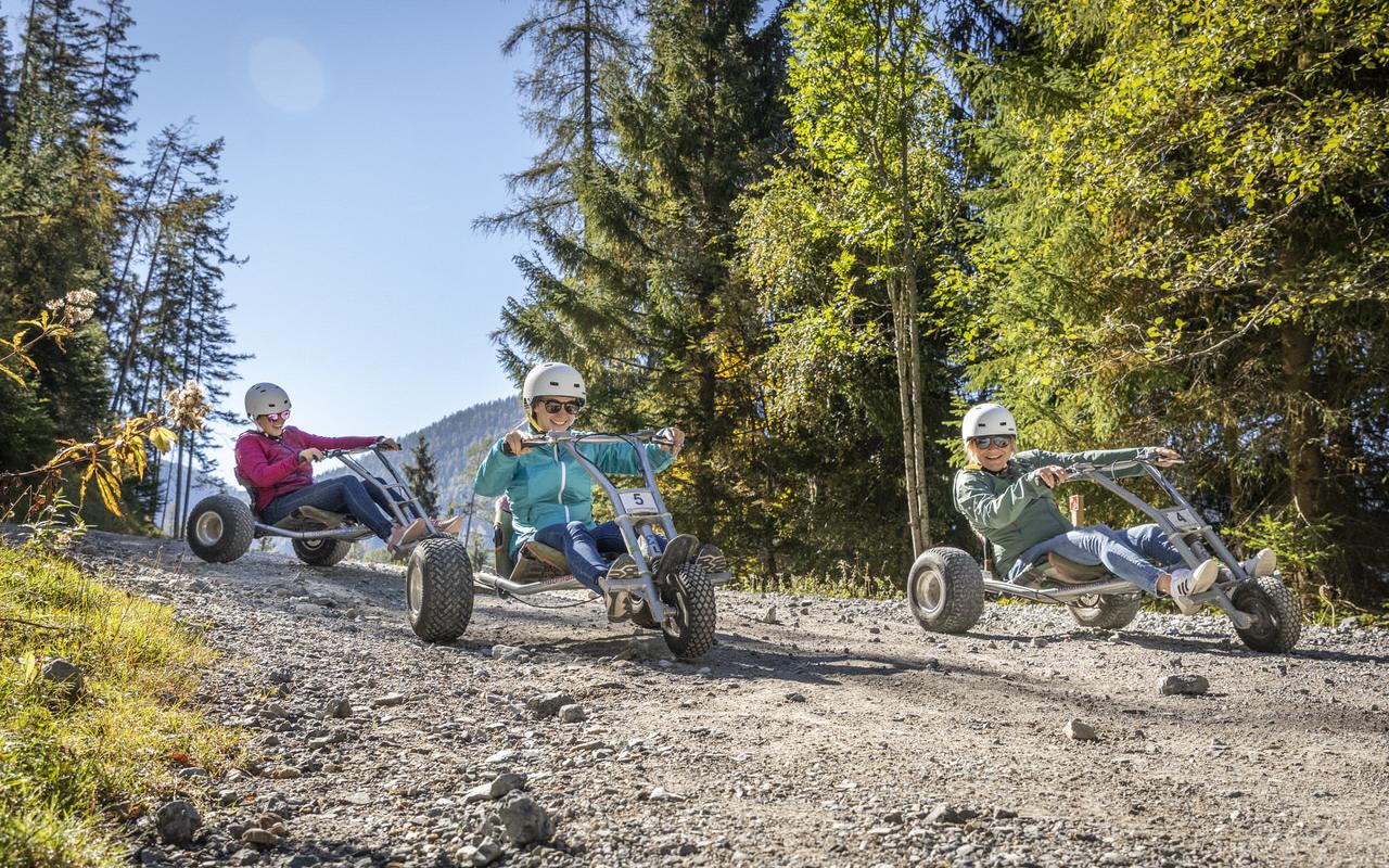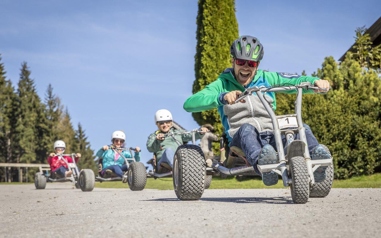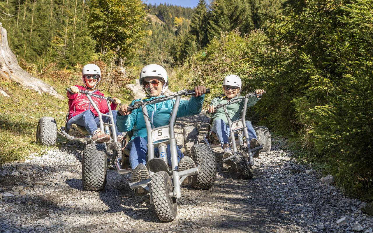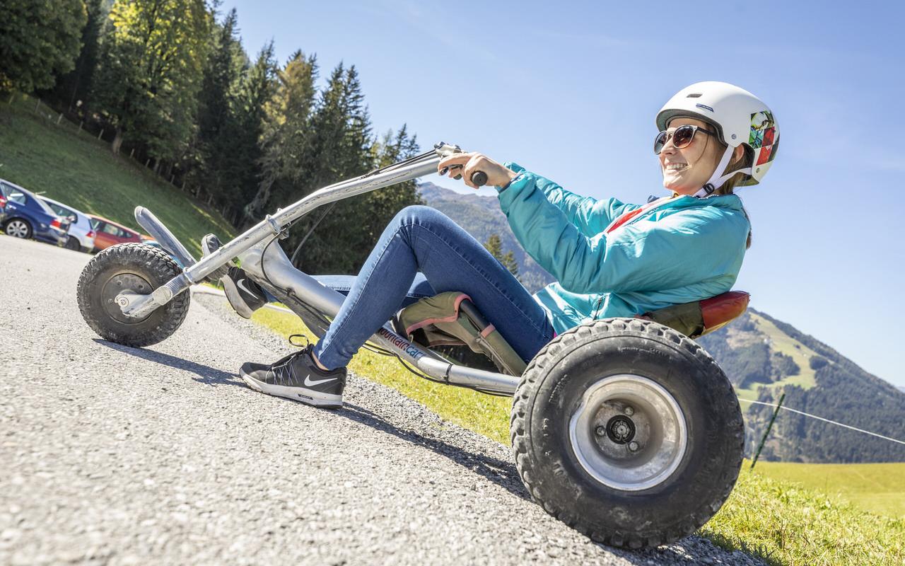 Mit den alpinen Carts geht es auf einer Schotterstraße ins Tal hinab. Die Geschwindigkeit der Abfahrt kann jeder Fahrer selber wählen. Mit dem Veranstalter Sport am Jet in Flachau kann man diesen Sommersport erleben.