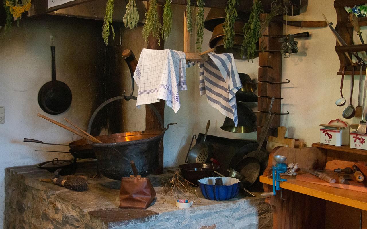 Alte Stube mit offenem Kamin und Holztisch