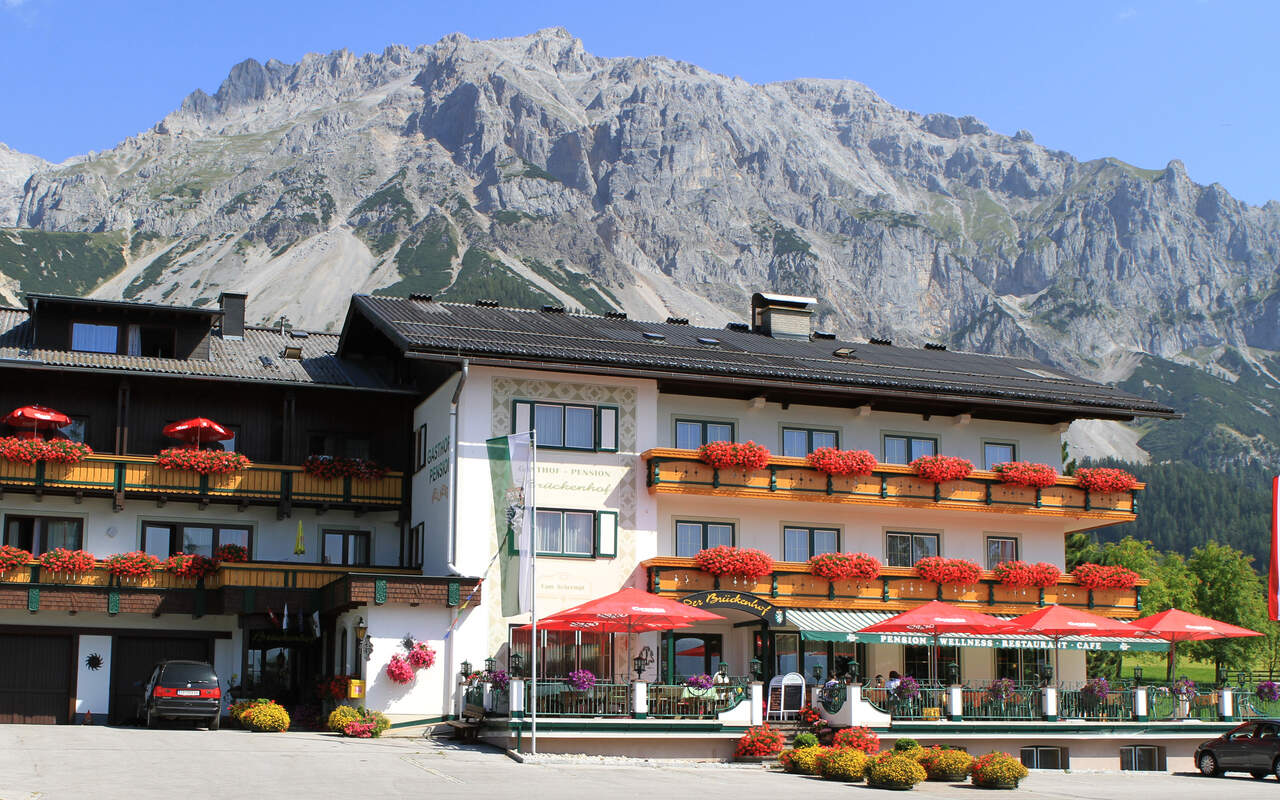 Sommer- und Winterurlaub bietet der Brückenhof in Ramsau am Dachstein in günstigster Lage benachbart zum Rittisberg, dem 4 Jahreszeiten Familien-Abenteuerberg. Im  3 - Sterne - Hotel mit Gasthof kann man aus 9 Zimmertypen seine individuelle Unterbringungsvariante wählen: Es stehen Zimmer, Suiten, Familienzimmer, Apartments von 2 - 5 Personen zur Verfügung. Das Haus ist wunderschön umrahmt vom Dachsteinmassiv.