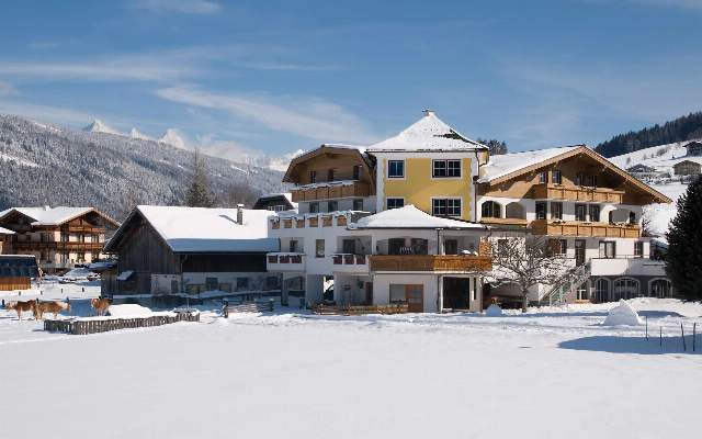 Unter blauem Winterhimmel bietet das Hubengut ein schoenes Zuhause fuer seine Gaeste