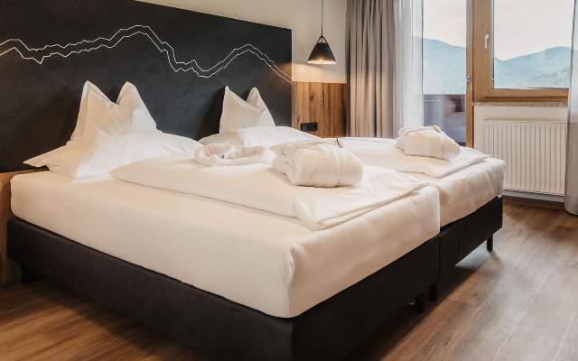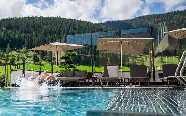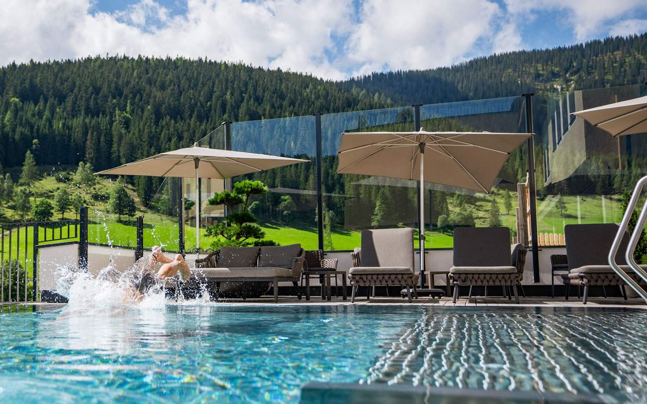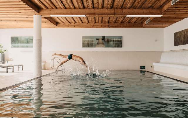 Wellness findet hier drinnen und draußen statt. Der Entschleunigung ein Stück entgegen schwimmen im Indoor- oder Outdoor-Infinity-Pool. Vormittags am Berg, nachmittags in der Sauna. Und dazwischen gibt es nur Ruhe. Die wahre Kunst des Abschaltens offenbart sich zwischen Panoramablick, den weichen Betten und schwebenden Liegen der Wohlfühloase.