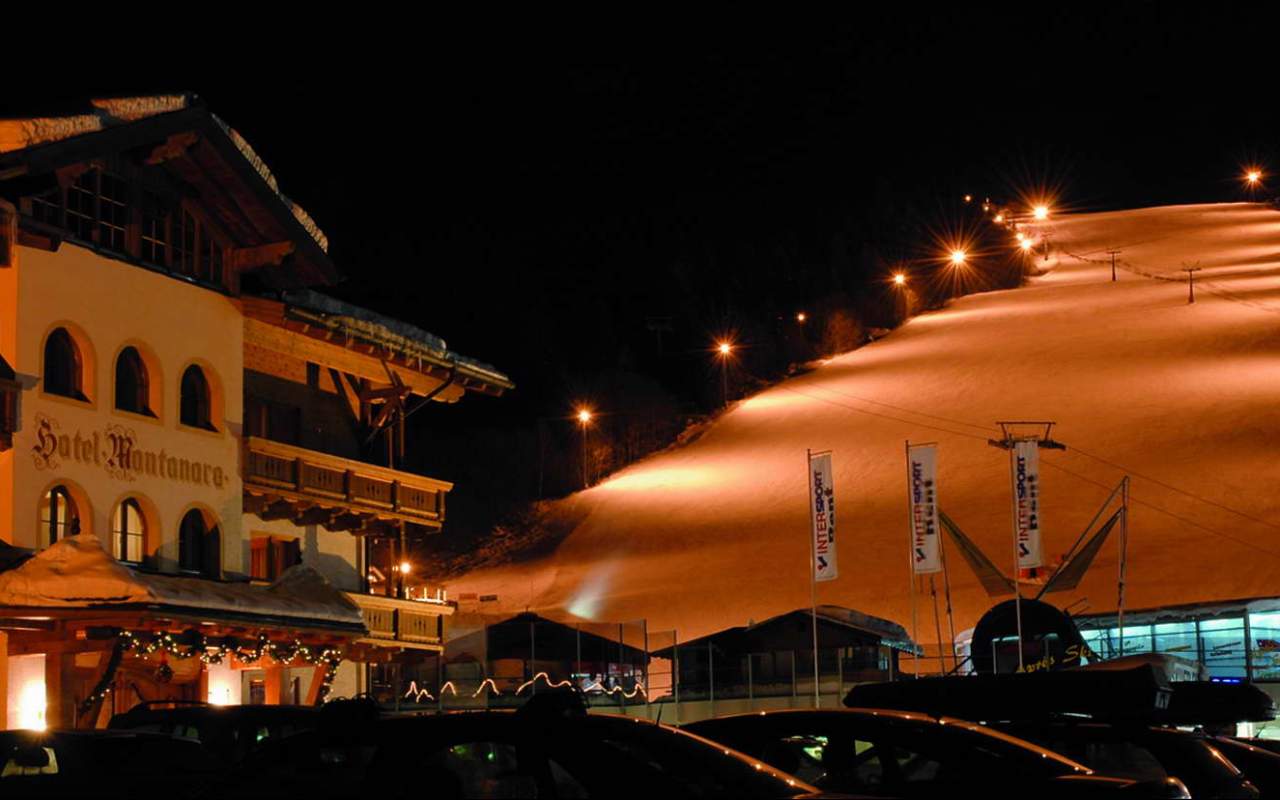 Luxuriös ist die Lage des Hotels. Wenige Schritte sind es nur bis zur Gondelbahn auf das Grießenkar. Schon von den Zimmern aus bietet sich ein traumhafter Blick auf die geschmeidigen Hänge der Skipisten und den verschneiten Wald.