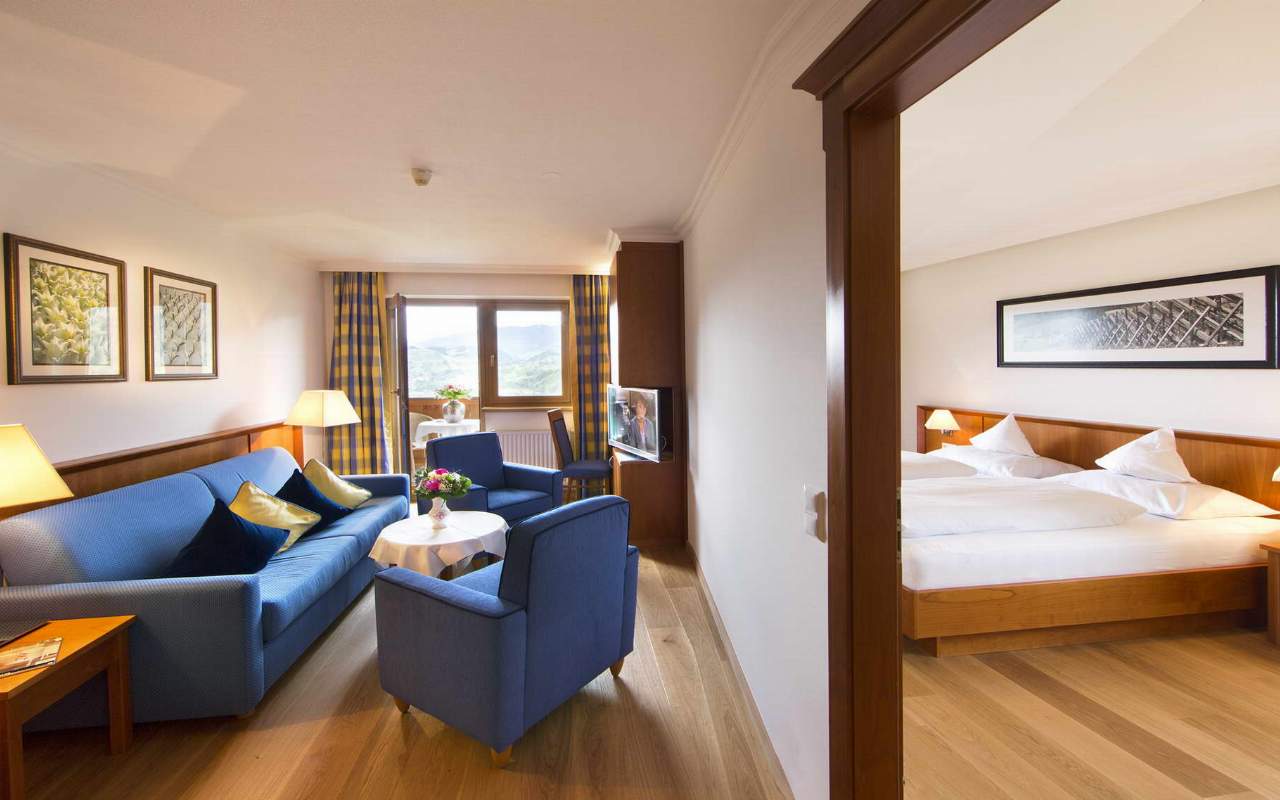Die Komfort-Doppelzimmer und Suiten erscheinen im modernen Landhausstil mit zahlreichen exklusiven Ausstattungsvarianten vom gemütlichen Kachelofen bis zum Whirlpool. Das Hotel bietet verschiedene ausgewählte Unterbringungsarten Junior-Familiensuiten, Panoramasuiten, Landhaus Suiten de Luxe, Kombi-Familienzimmer sowie eine Wellness Familiensuite.