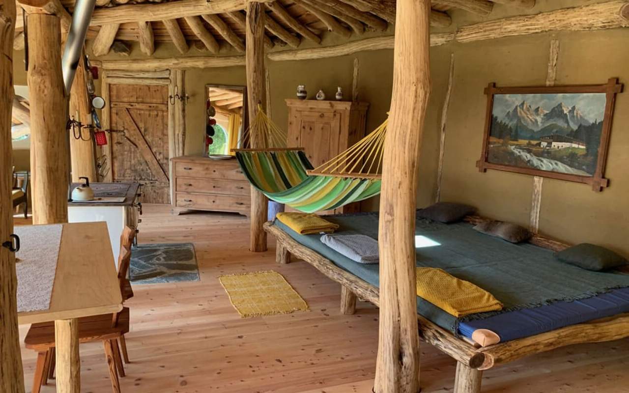 Die Hobbyt-Häuser befinden sich nur 300 m oberhalb vom Bauernhaus - dem Abenteuerhof. Als geräumige Einraum-Lodges konzipiert sind sie mit dem Notwendigsten ausgestattet, wie gemütlichen Schlafstellen (Schlafpritschen, Hängematten oder Chaiselongue) sowie einem Holzherd, der zum Heizen und Kochen verwendet wird. Das Wasser holst du direkt vom Brunnen und das Humus-Klo ist ca. 20 m von den Häusern entfernt.
