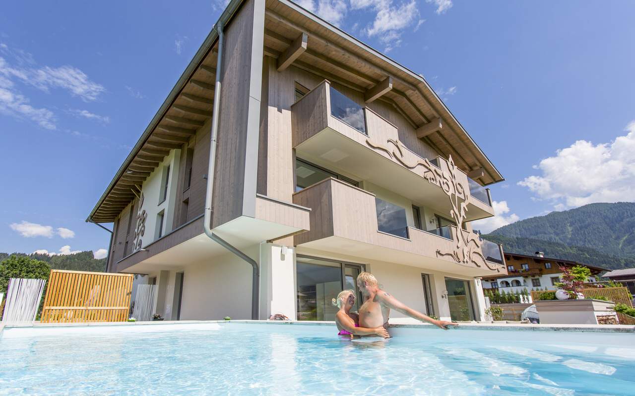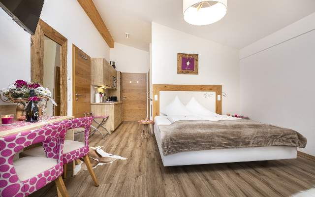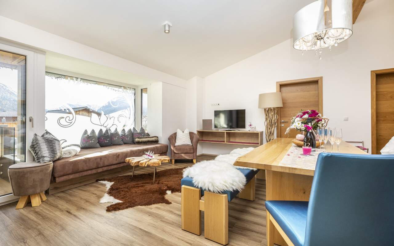 Furnished in typical Alpine style, the flats and suites offer all the comforts of exquisite holiday accommodation. The rooms show an extraordinary design supported by special elements, such as a large couch directly at the window front and an electric fireplace.